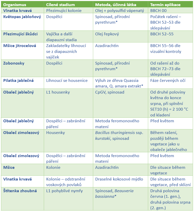 Tab. 2: Seznam přípravků a metod ochrany v ekologických produkcích proti hlavním škůdcům jabloní (*povoleno v zahraničí nebo účinnost prokázána experimentálně)